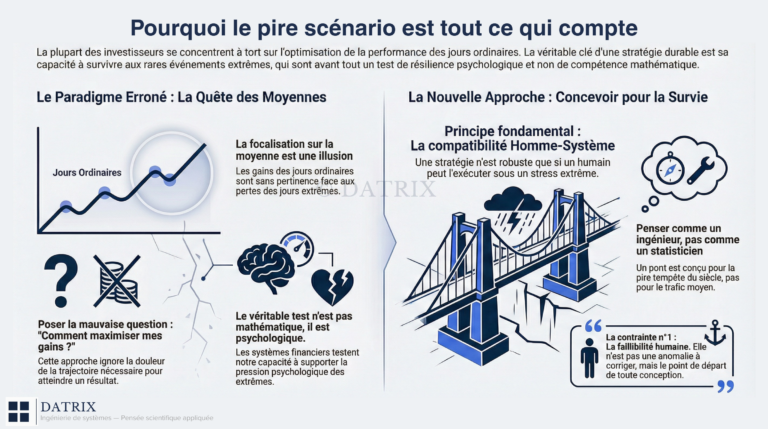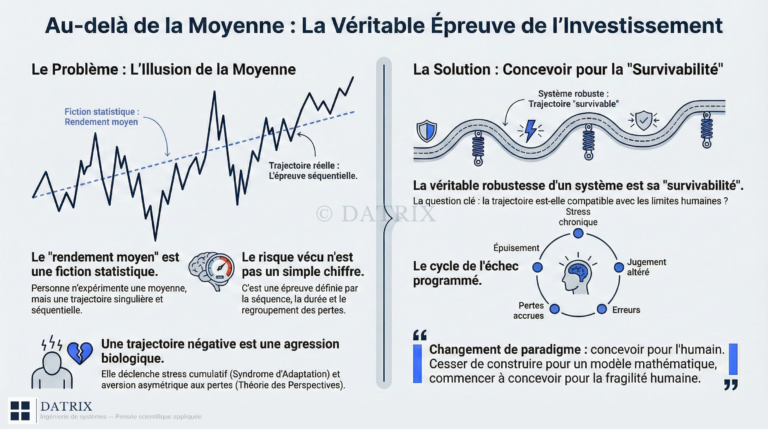 La manière habituelle de penser le problème est une impasse. Les expressions « couple risque/rendement » ou « compromis risque/rendement » sont des pièges sémantiques. Elles suggèrent une relation linéaire et interchangeable, comme si le risque était simplement un rendement négatif, masquant ainsi une différence de nature profonde et irréconciliable. L’analyse se concentre alors à tort sur des chiffres agrégés – volatilité, performance annuelle – qui sont des résumés ex post d’un parcours terminé. L’objet pertinent n’est pas le résultat final, mais le chemin parcouru pour y parvenir. Comme l’exprime une vérité fondamentale de la gestion du risque : « Ce que le système exige de l’opérateur n’est pas de supporter un résultat, mais de traverser une trajectoire. » La vraie question n’est donc pas de savoir si le résultat final est bon, mais si la trajectoire est humainement soutenable. La question pertinente n’est donc pas « Combien de risque dois-je prendre pour obtenir ce rendement ? », mais plutôt « Quelle est la nature de la trajectoire que je suis prêt à traverser, et quelles sont les conditions de survie en chemin ? ».